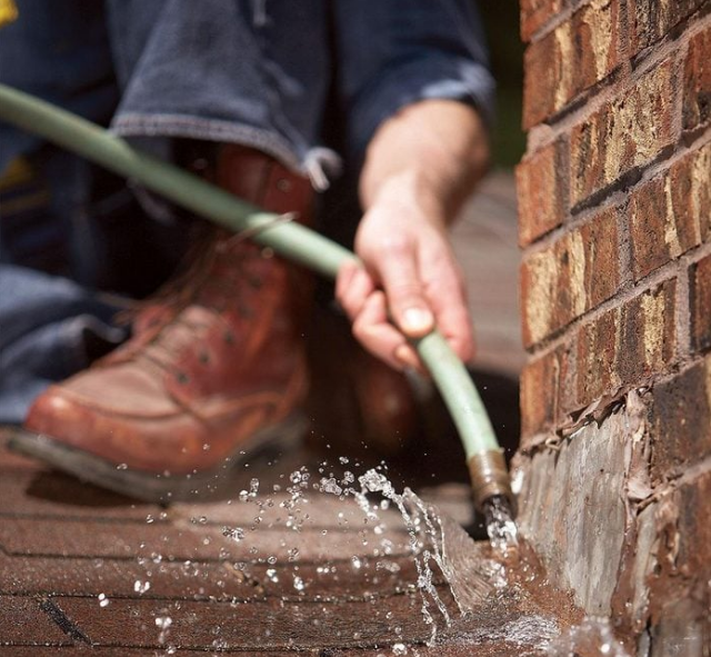 - Go on the roof with a hose and start low on the area above the interior stain.