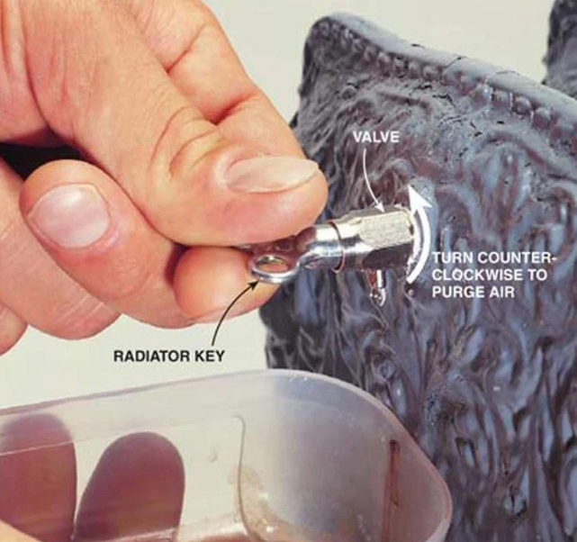 If some fins of your hot water radiator stay cold while others get hot, don’t despair. Your radiator has some trapped air, and getting rid of it is simple. At the top of your radiator, look for a small valve like the one shown. Use a radiator key, 1/4-in. 12-point socket, or a flat screwdriver (depending on your valve type) and slowly turn the valve counterclockwise until water starts dripping out. This will release trapped air and let hot water into the cold fins. While you’re at it, you should repeat the process with your other radiators.